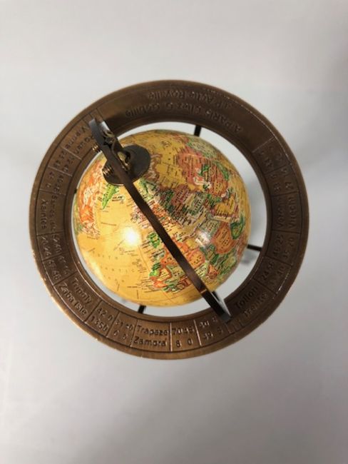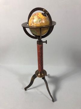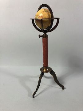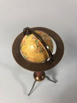 Table top world globe on brass tripod stand approximately 28cm high